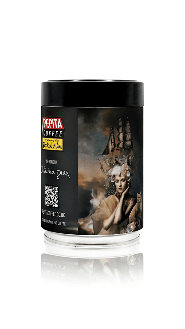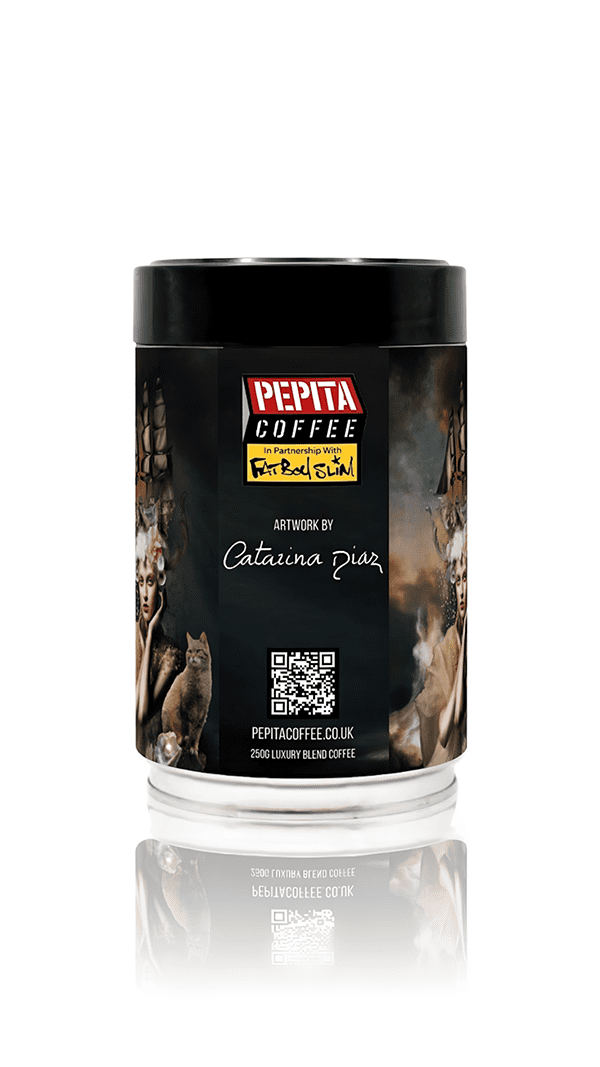 Art Meets Rhythm – Exclusive Pepita Coffee in partnership with Fatboy Slim x Catarina Diaz collaboration. This limited-edition collectable art coffee tin features Catarina Diaz’s transcendent Voyage in Gold design, a layered dreamscape of memory, nature, mythology, femininity, and transformation in analogue collage, oil painting, and mixed media. Packed with 250g luxury 100% Arabica blend from the world’s best origins: Colombia, Guatemala, and Ethiopia – rich, aromatic, full-bodied, ethically sourced premium coffee.