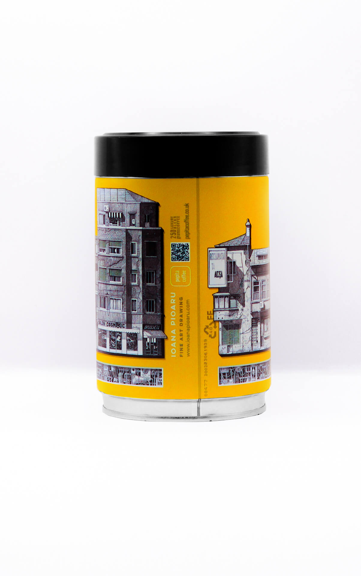 Discover the Ioana Pioaru Collectable Coffee Tin, a collaboration with Pepita Coffee. This sophisticated tin features exclusive artwork by the acclaimed Romanian-British artist Ioana Pioaru, known for her multidisciplinary practice spanning traditional drawing, printmaking, VR art, and holography.